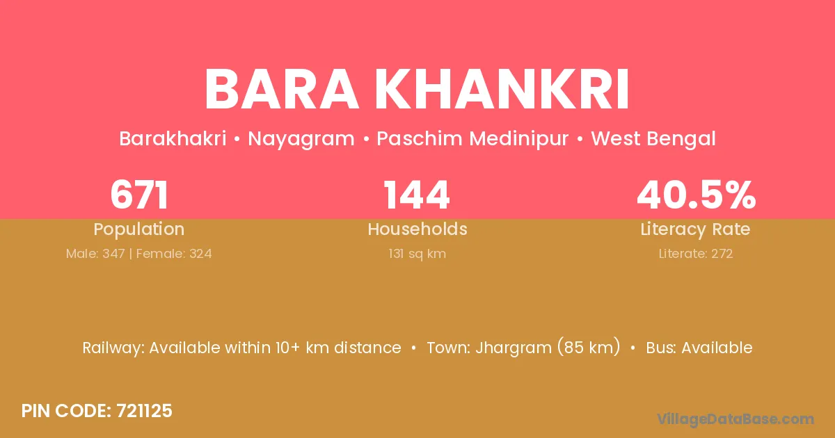 Jhargram (85 km) is the nearest town to Bara Khankri village for major economic activities and is located approximately 85 km away.