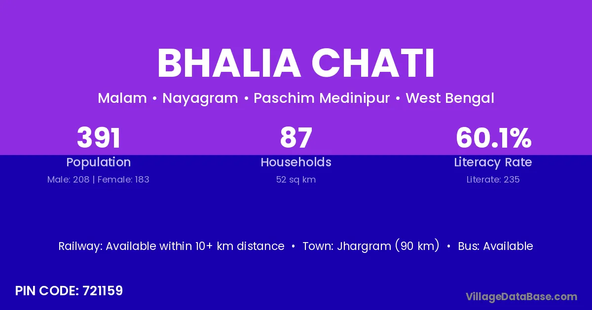 Jhargram (90 km) is the nearest town to Bhalia Chati village for major economic activities and is located approximately 90 km away.