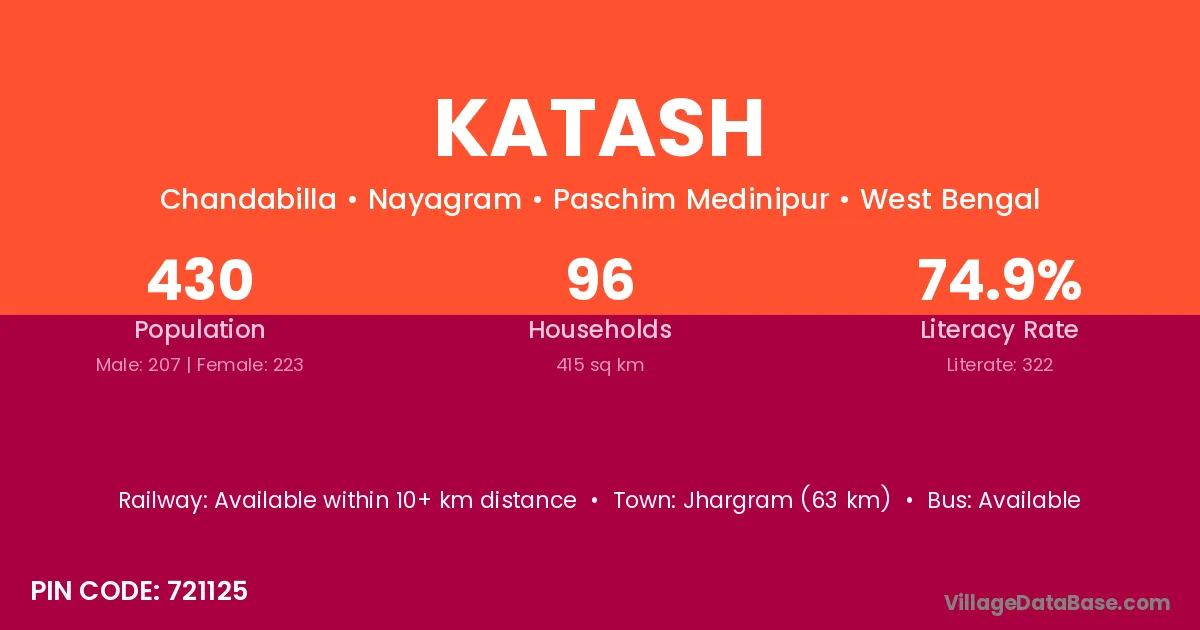 Jhargram (63 km) is the nearest town to Katash village for major economic activities and is located approximately 63 km away.