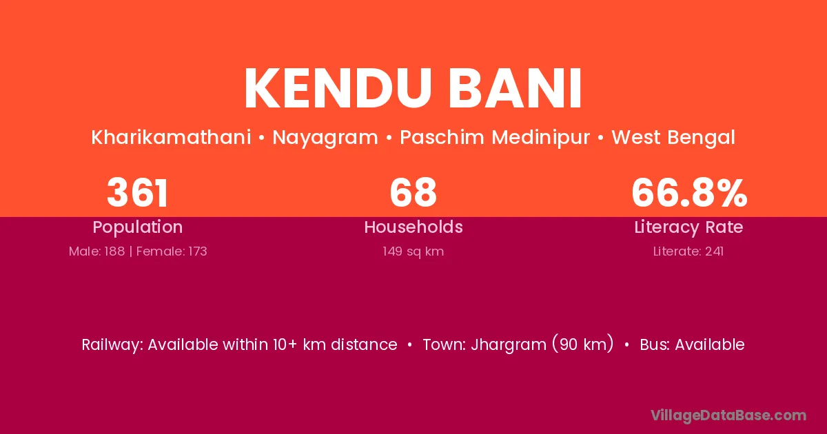 Jhargram (90 km) is the nearest town to Kendu Bani village for major economic activities and is located approximately 90 km away.