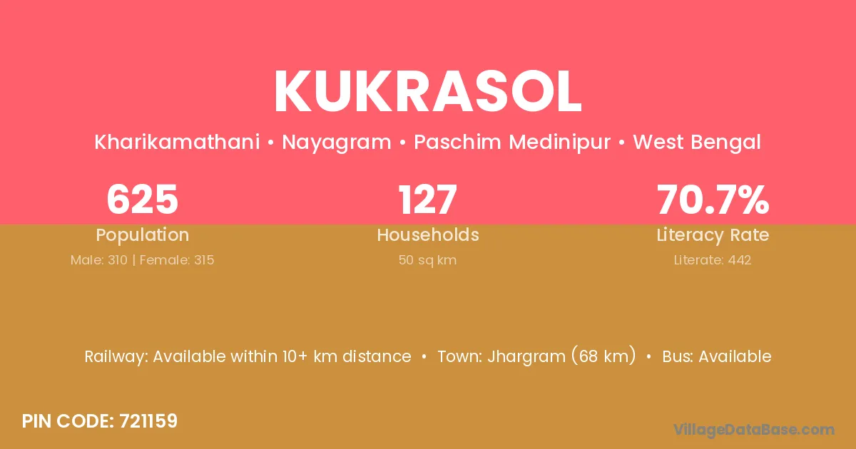Jhargram (68 km) is the nearest town to Kukrasol village for major economic activities and is located approximately 68 km away.