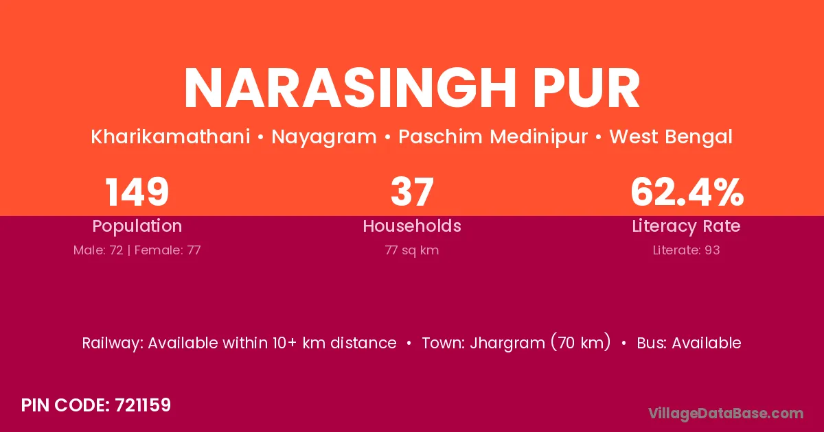 Jhargram (70 km) is the nearest town to Narasingh Pur village for major economic activities and is located approximately 70 km away.