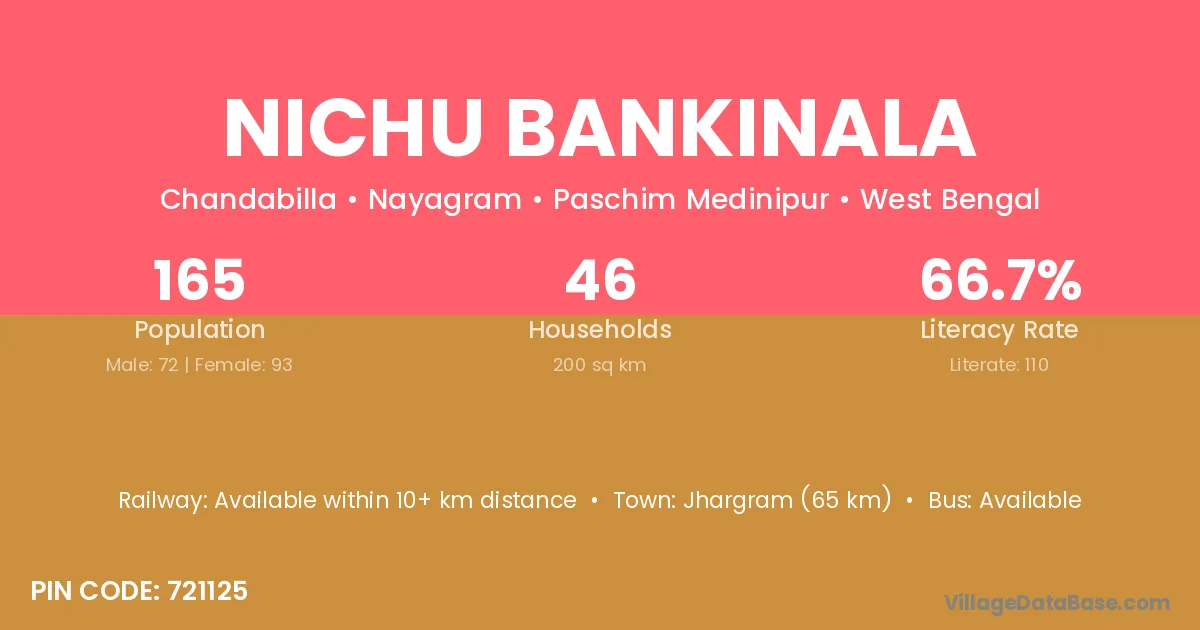 Jhargram (65 km) is the nearest town to Nichu Bankinala village for major economic activities and is located approximately 65 km away.