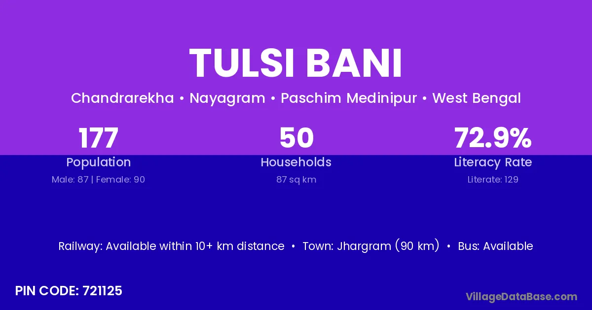Jhargram (90 km) is the nearest town to Tulsi Bani village for major economic activities and is located approximately 90 km away.