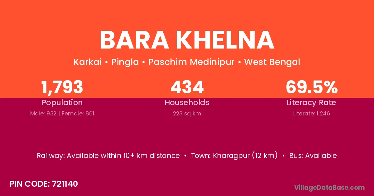 Kharagpur (12 km) is the nearest town to Bara Khelna village for major economic activities and is located approximately 12 km away.
