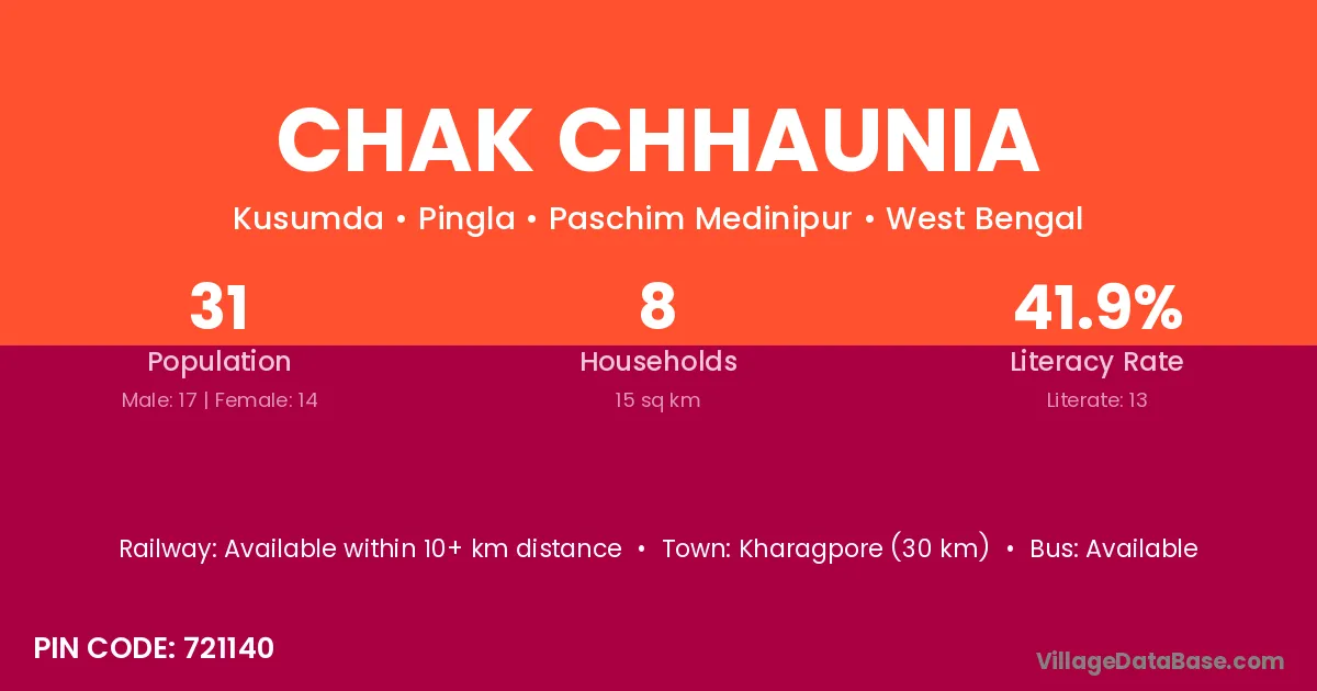 Kharagpore (30 km) is the nearest town to Chak Chhaunia village for major economic activities and is located approximately 30 km away.