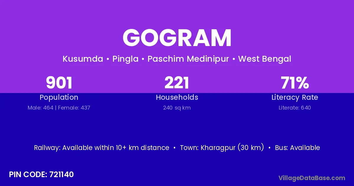 Kharagpur (30 km) is the nearest town to Gogram village for major economic activities and is located approximately 30 km away.