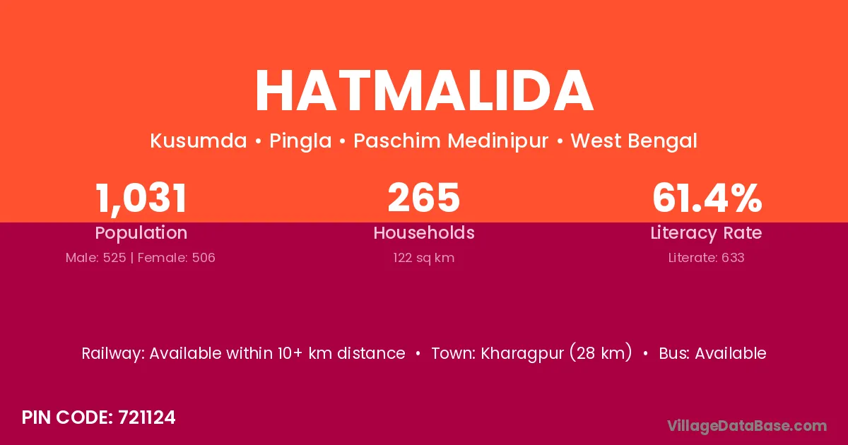 Kharagpur (28 km) is the nearest town to Hatmalida village for major economic activities and is located approximately 28 km away.