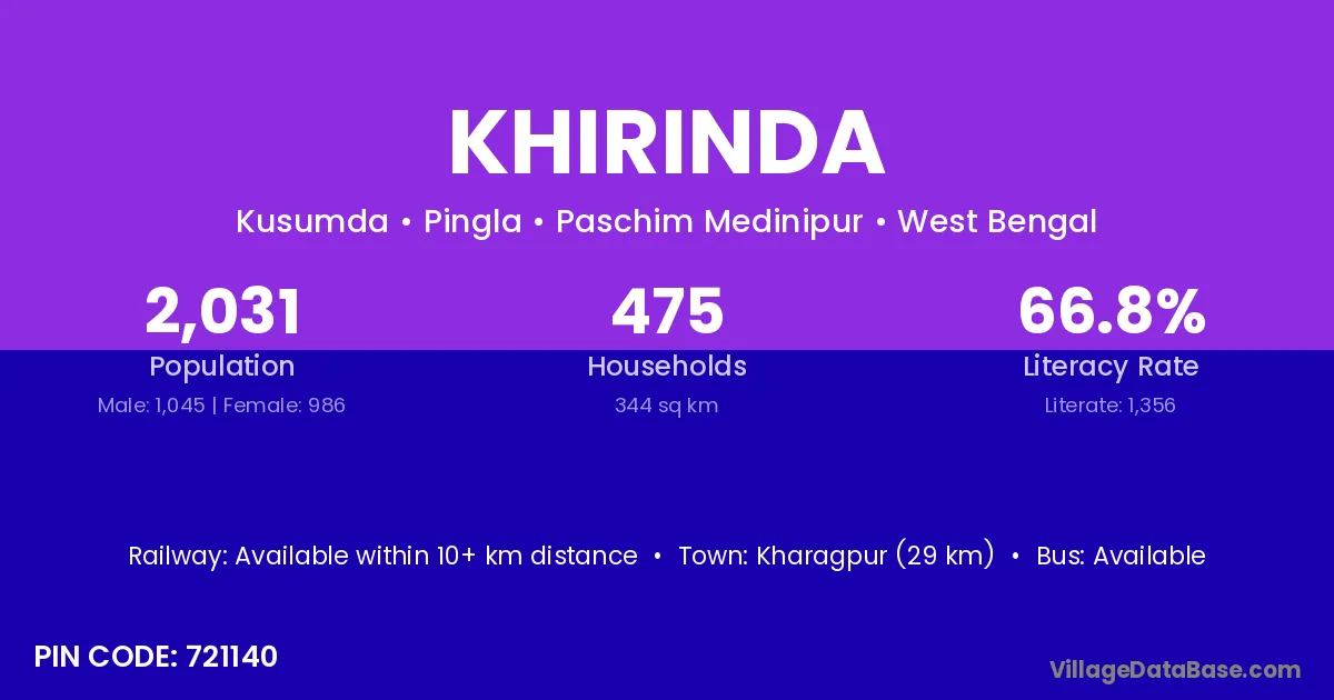 According to Census 2011 information, the village code of Khirinda village is 721140.