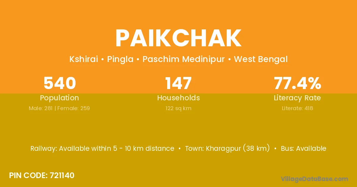 According to Census 2011 information, the village code of Paikchak village is 721140.