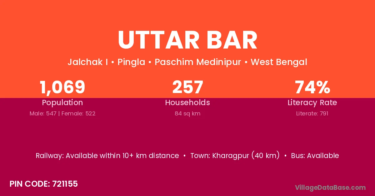Kharagpur (40 km) is the nearest town to Uttar Bar village for major economic activities and is located approximately 40 km away.