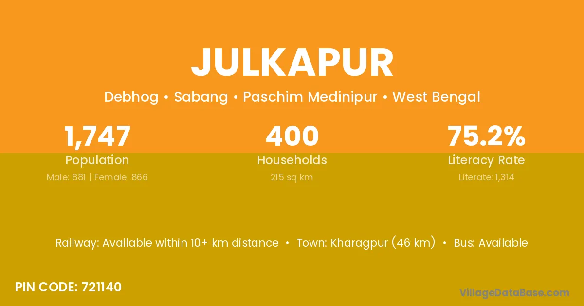 Kharagpur (46 km) is the nearest town to Julkapur village for major economic activities and is located approximately 46 km away.