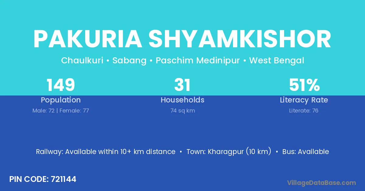 Kharagpur (10 km) is the nearest town to Pakuria Shyamkishor village for major economic activities and is located approximately 10 km away.