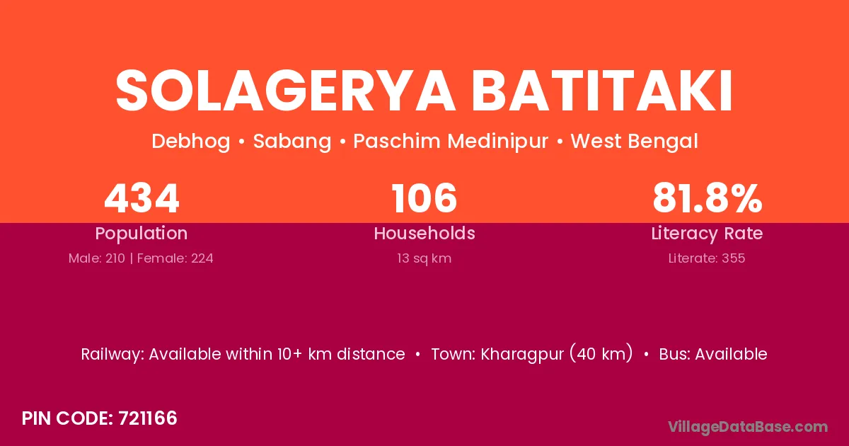 Kharagpur (40 km) is the nearest town to Solagerya Batitaki village for major economic activities and is located approximately 40 km away.