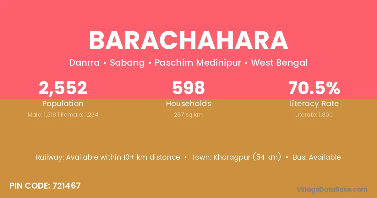 Kharagpur (54 km) is the nearest town to Barachahara village for major economic activities and is located approximately 54 km away.