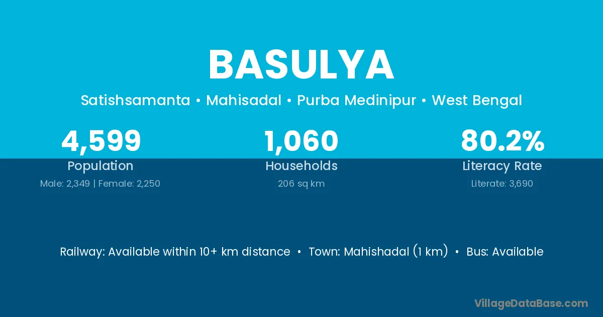Kharagpur (67 km) is the nearest town to Basulya village for major economic activities and is located approximately 67 km away.