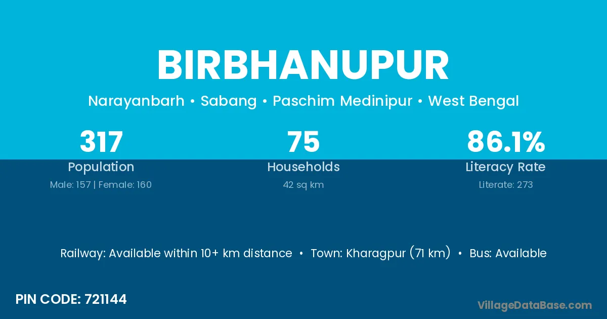 Kharagpur (71 km) is the nearest town to Birbhanupur village for major economic activities and is located approximately 71 km away.