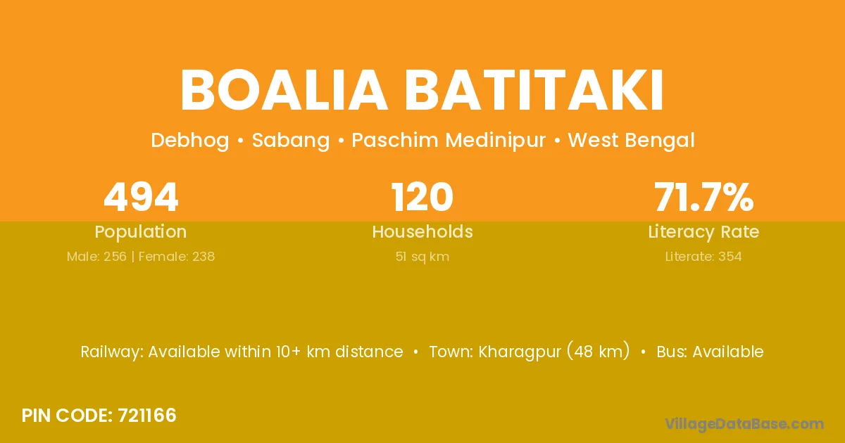 Kharagpur (48 km) is the nearest town to Boalia Batitaki village for major economic activities and is located approximately 48 km away.