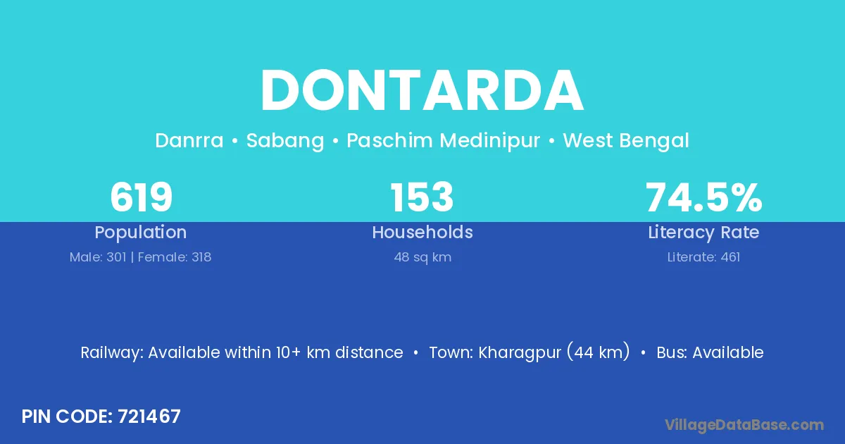 Kharagpur (44 km) is the nearest town to Dontarda village for major economic activities and is located approximately 44 km away.