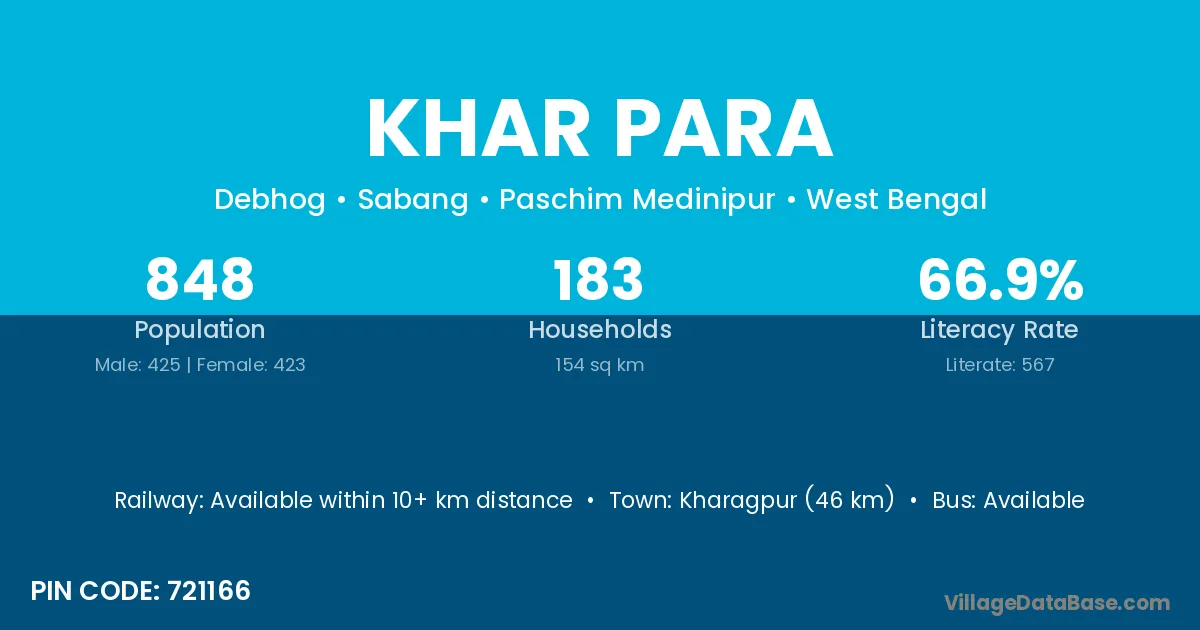 Kharagpur (46 km) is the nearest town to Khar Para village for major economic activities and is located approximately 46 km away.