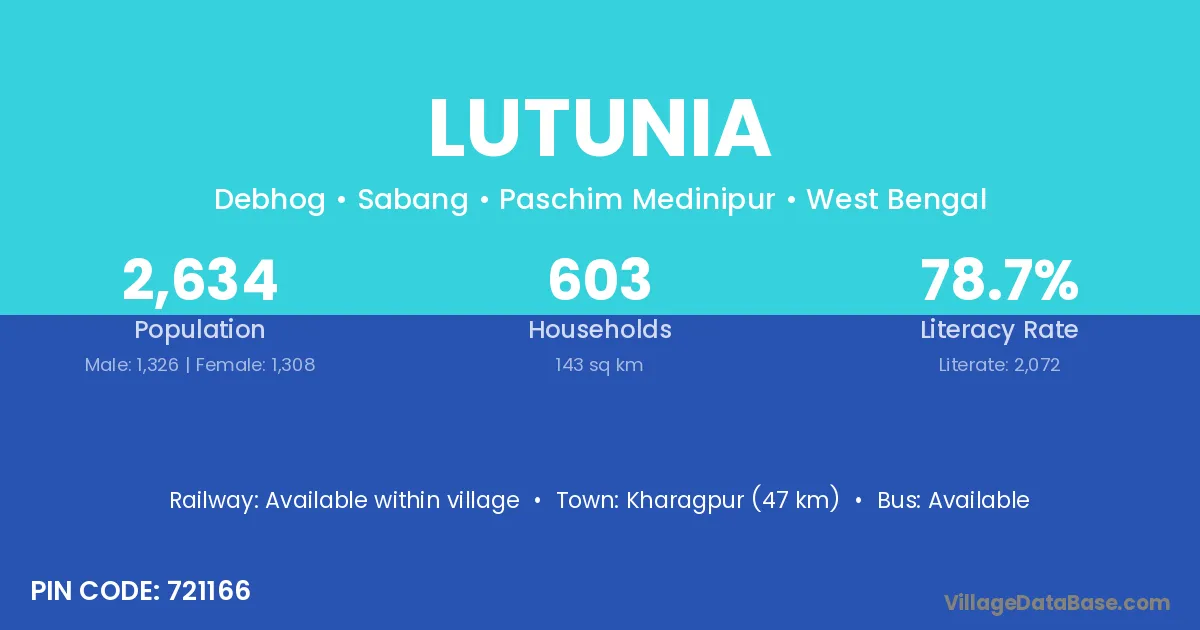 Lutunia village is located in the Sabang Subdivision of the Paschim Medinipur district in West Bengal.