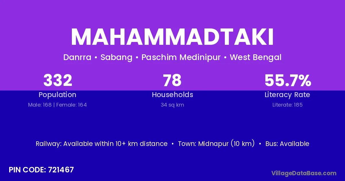 Midnapur (10 km) is the nearest town to Mahammadtaki village for major economic activities and is located approximately 10 km away.