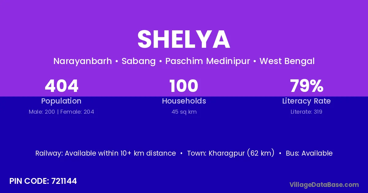 Kharagpur (62 km) is the nearest town to Shelya village for major economic activities and is located approximately 62 km away.