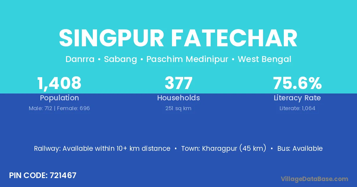 Kharagpur (45 km) is the nearest town to Singpur Fatechar village for major economic activities and is located approximately 45 km away.