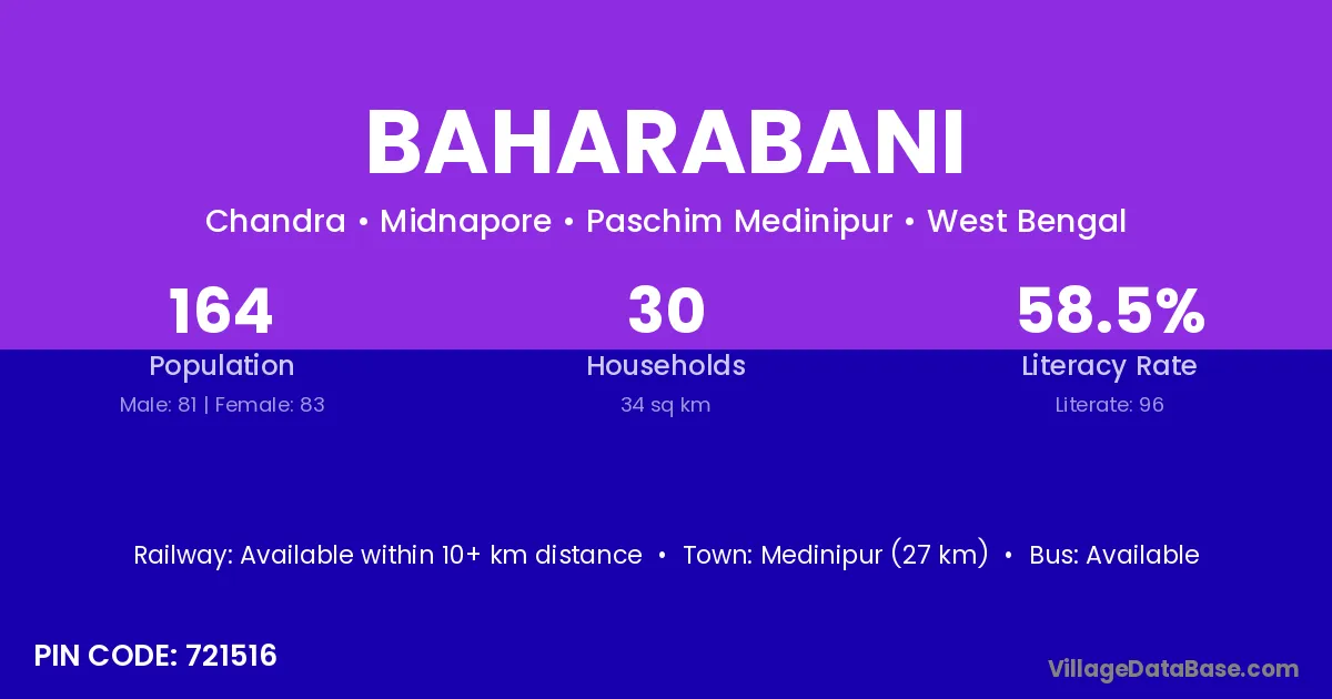 Medinipur (27 km) is the nearest town to Baharabani village for major economic activities and is located approximately 27 km away.