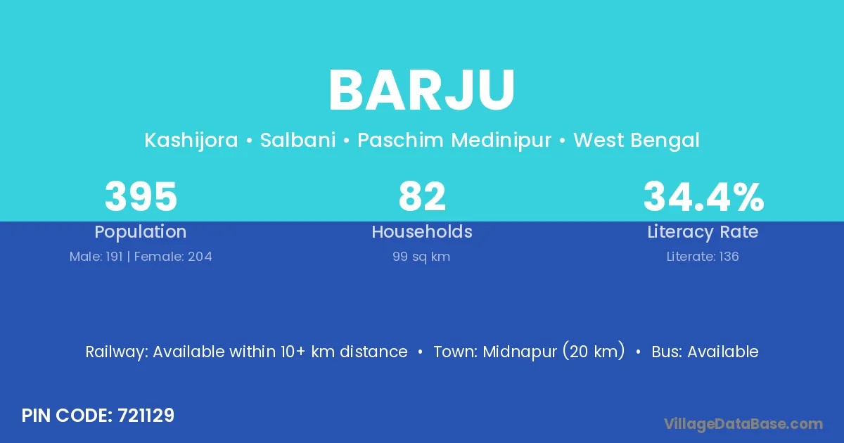 Midnapur (20 km) is the nearest town to Barju village for major economic activities and is located approximately 20 km away.