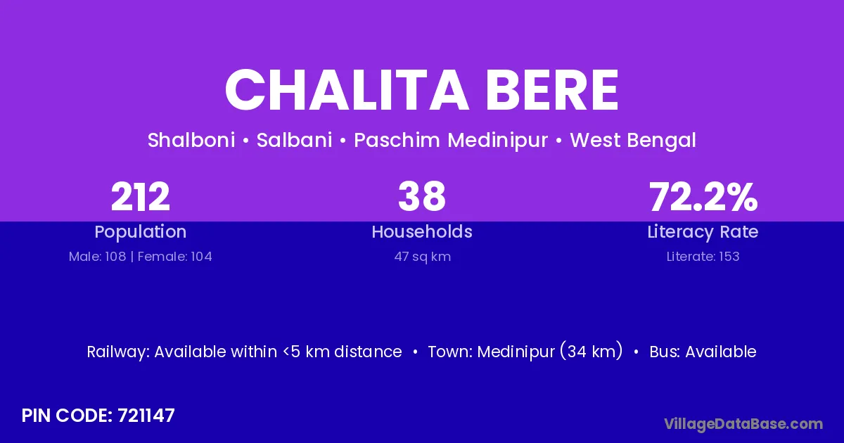 Medinipur (34 km) is the nearest town to Chalita Bere village for major economic activities and is located approximately 34 km away.