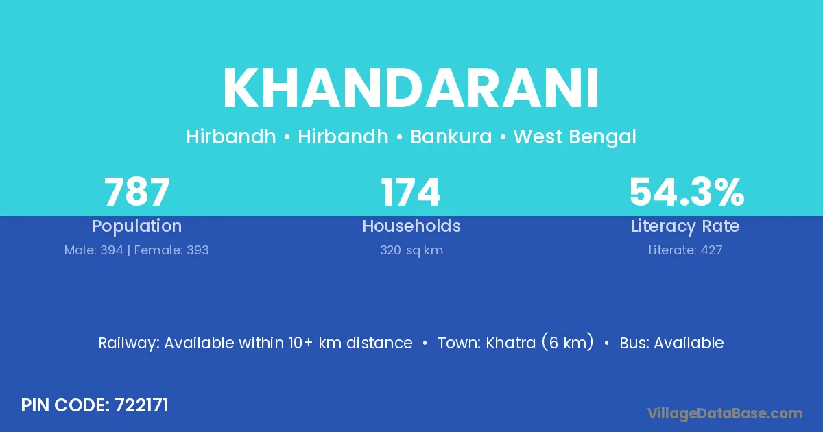 Medinipur (33 km) is the nearest town to Khandarani village for major economic activities and is located approximately 33 km away.