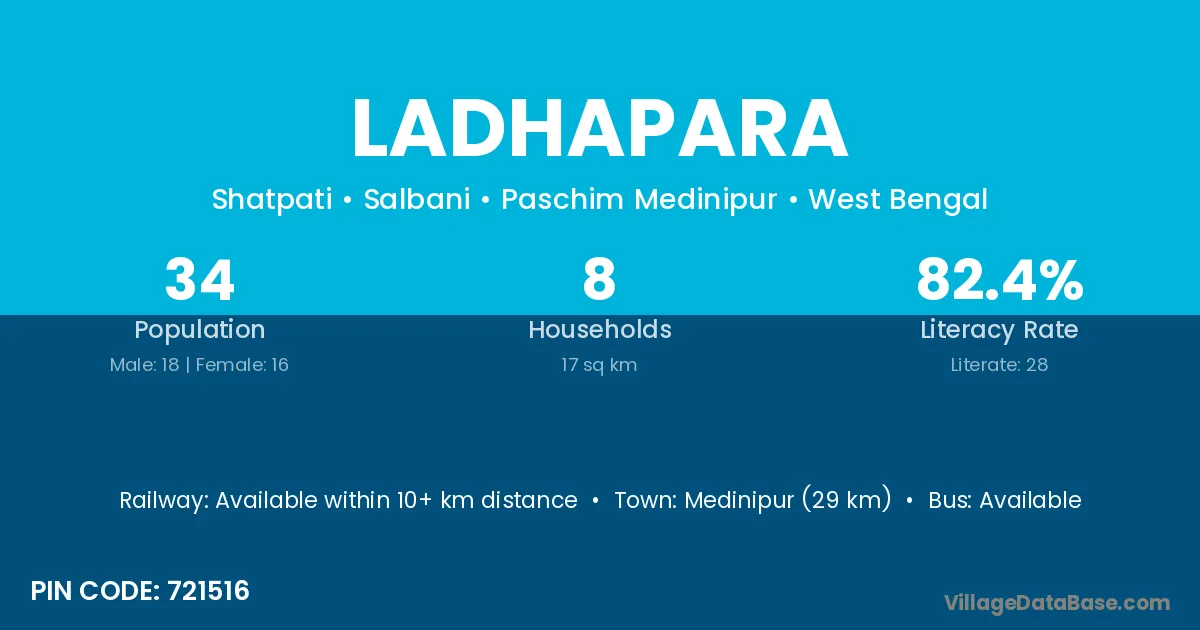 Medinipur (29 km) is the nearest town to Ladhapara village for major economic activities and is located approximately 29 km away.