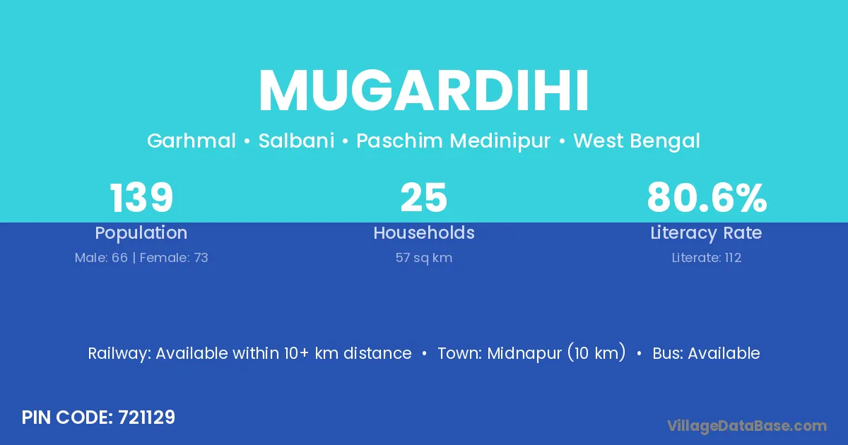 Midnapur (10 km) is the nearest town to Mugardihi village for major economic activities and is located approximately 10 km away.