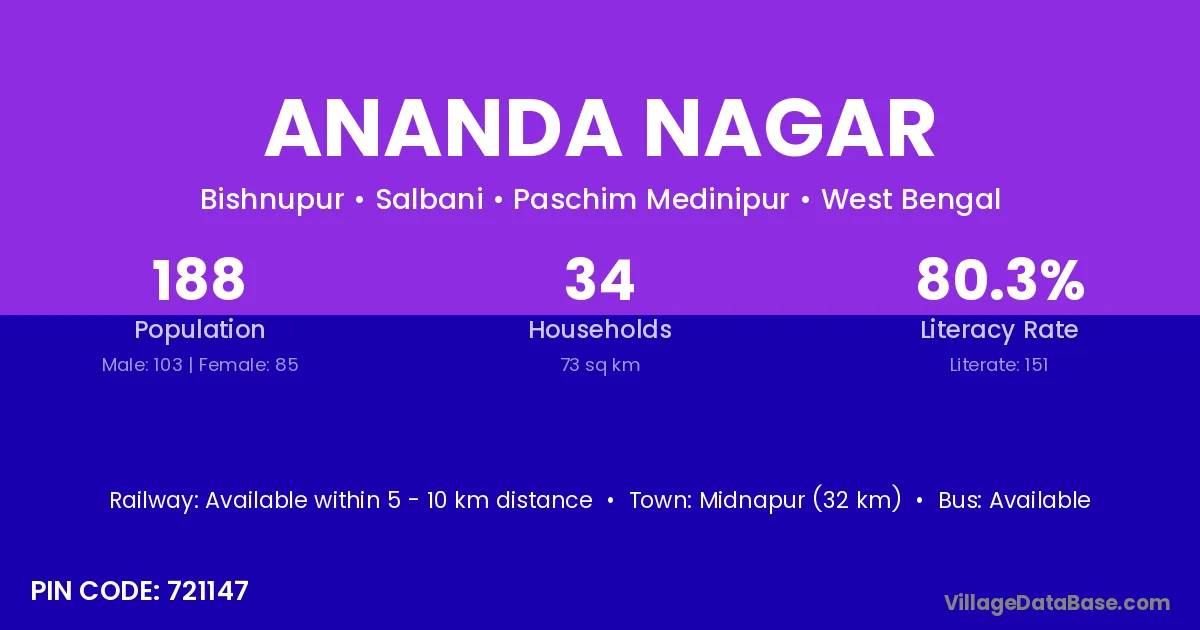 Midnapur (32 km) is the nearest town to Ananda Nagar village for major economic activities and is located approximately 32 km away.