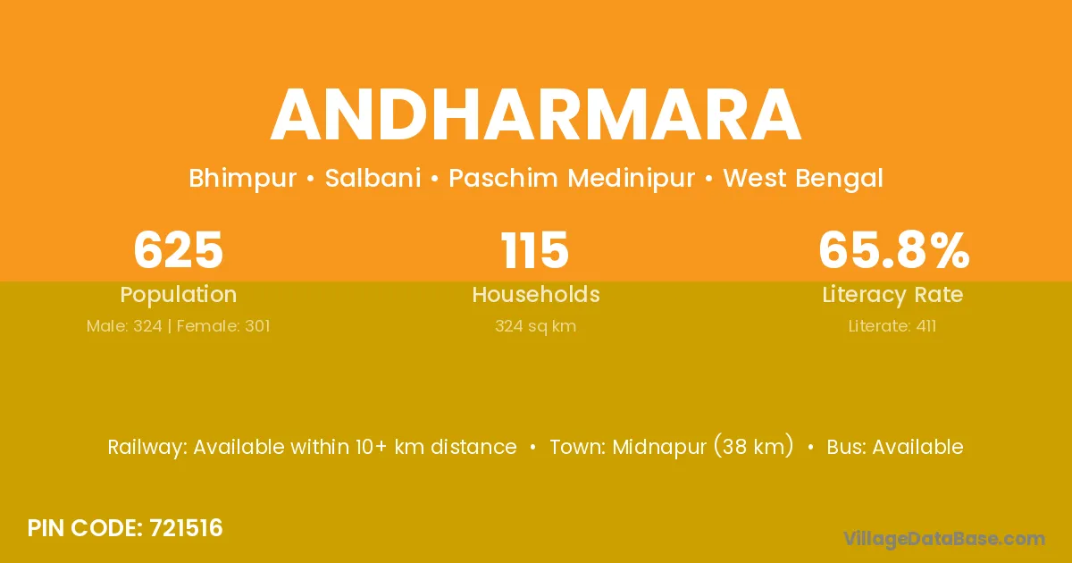 Midnapur (38 km) is the nearest town to Andharmara village for major economic activities and is located approximately 38 km away.