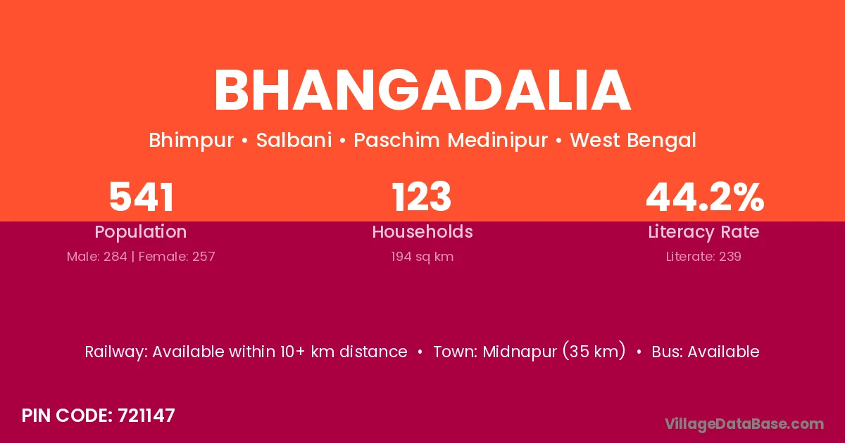 Midnapur (35 km) is the nearest town to Bhangadalia village for major economic activities and is located approximately 35 km away.