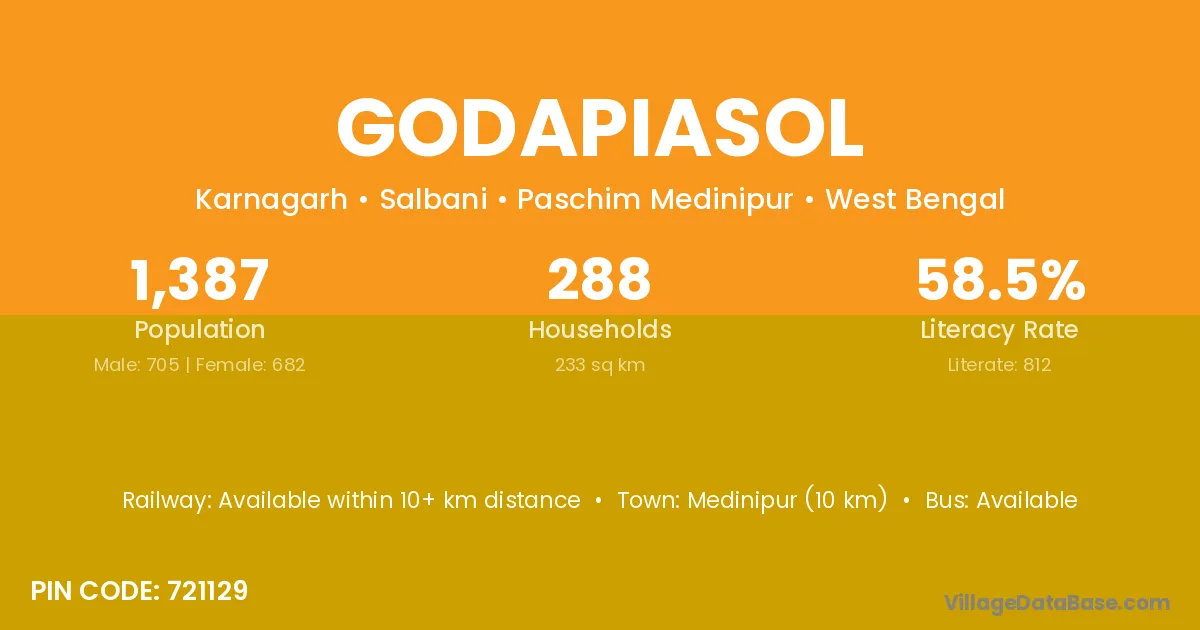 Medinipur (10 km) is the nearest town to Godapiasol village for major economic activities and is located approximately 10 km away.