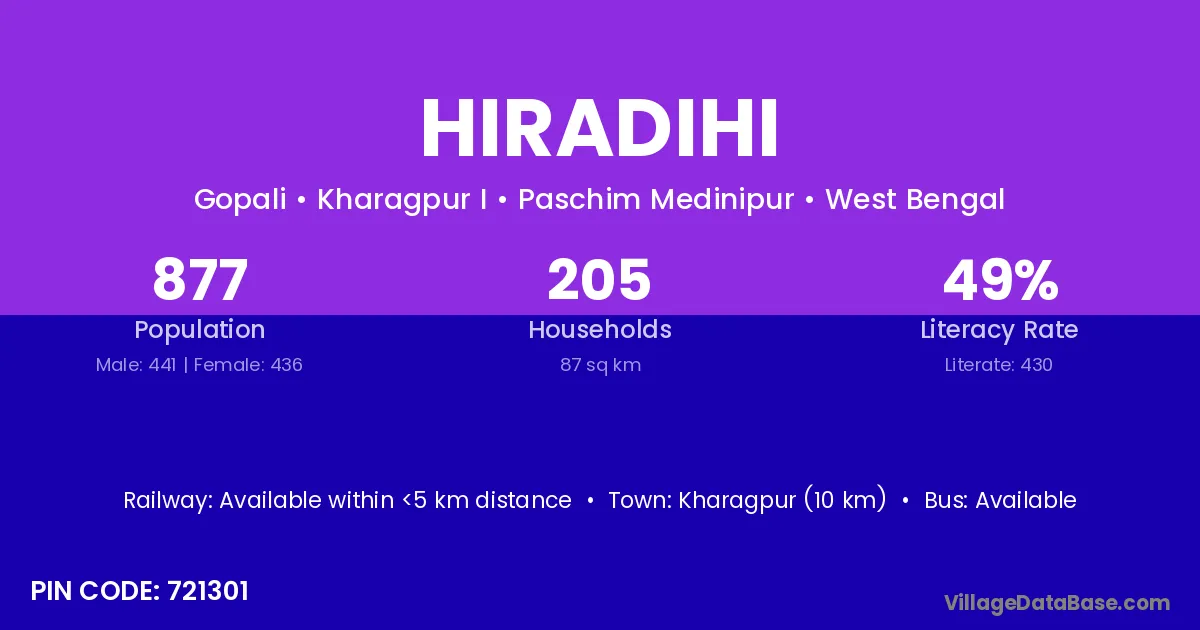 Midnapur (18 km) is the nearest town to Hiradihi village for major economic activities and is located approximately 18 km away.