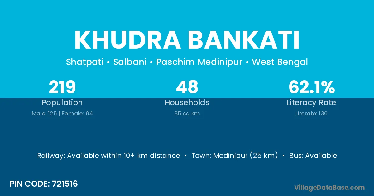 Medinipur (25 km) is the nearest town to Khudra Bankati village for major economic activities and is located approximately 25 km away.