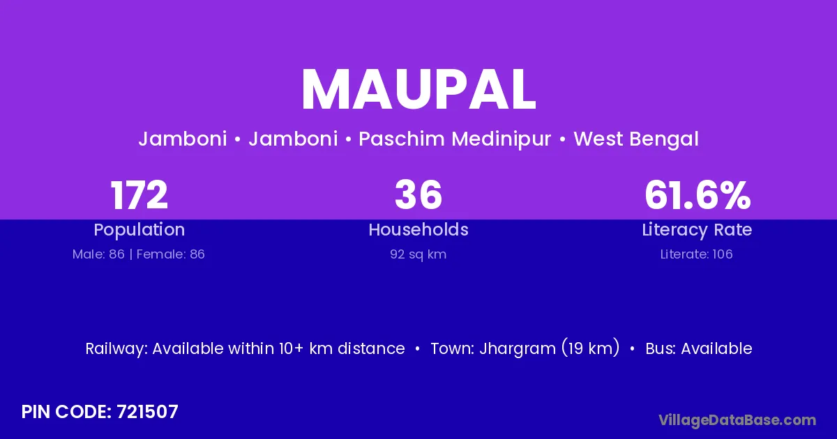 Midnapur (15 km) is the nearest town to Maupal village for major economic activities and is located approximately 15 km away.