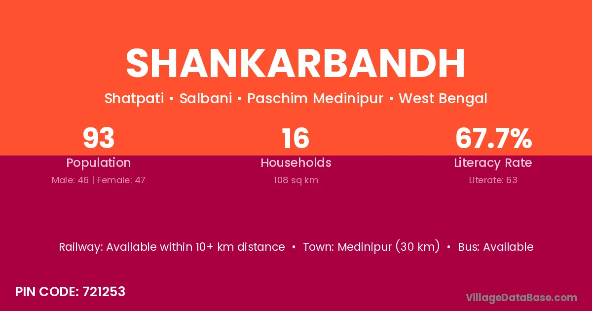 Medinipur (30 km) is the nearest town to Shankarbandh village for major economic activities and is located approximately 30 km away.