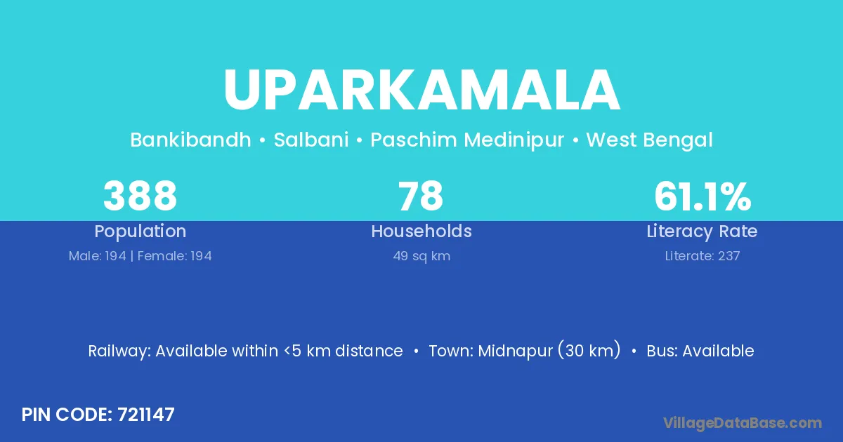 Midnapur (30 km) is the nearest town to Uparkamala village for major economic activities and is located approximately 30 km away.
