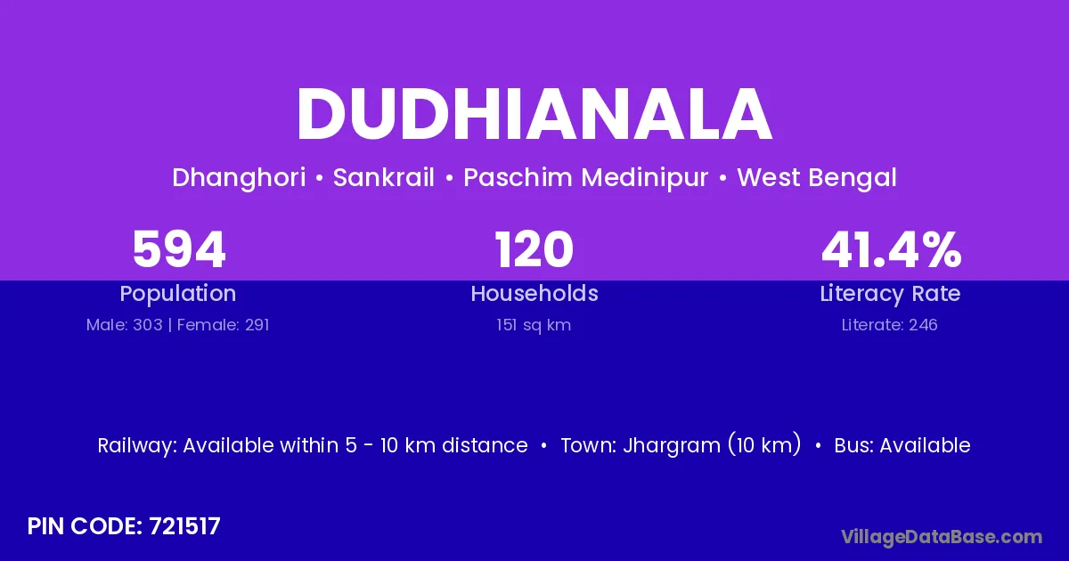 Jhargram (10 km) is the nearest town to Dudhianala village for major economic activities and is located approximately 10 km away.