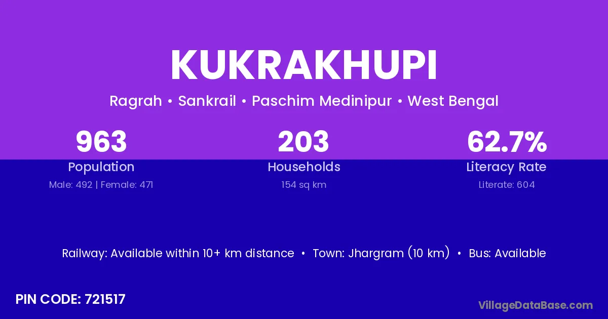 Jhargram (10 km) is the nearest town to Kukrakhupi village for major economic activities and is located approximately 10 km away.