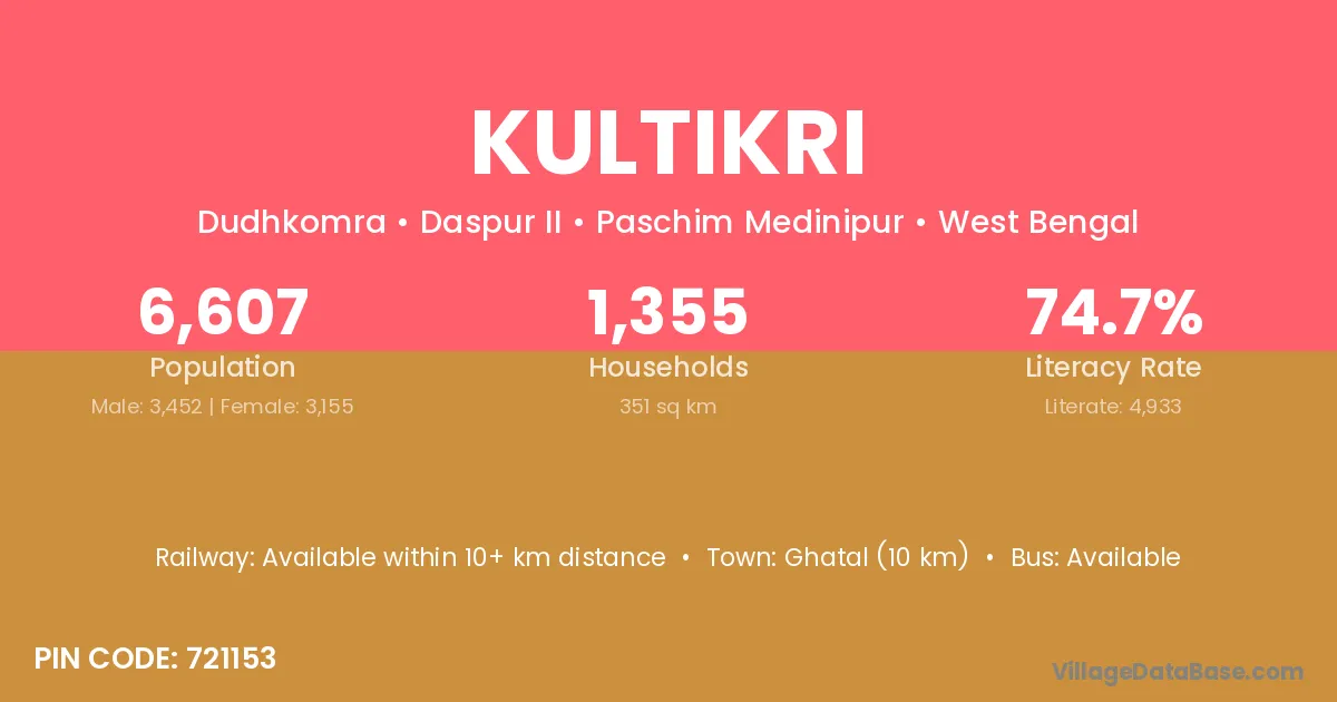 Kharagpur (45 km) is the nearest town to Kultikri village for major economic activities and is located approximately 45 km away.