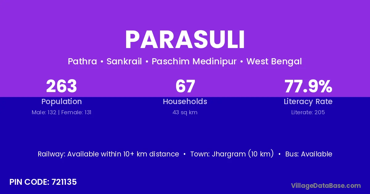Jhargram (10 km) is the nearest town to Parasuli village for major economic activities and is located approximately 10 km away.