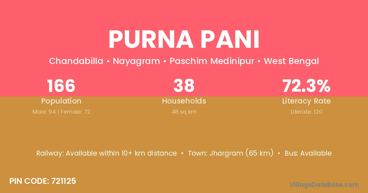 Kharagpur (36 km) is the nearest town to Purna Pani village for major economic activities and is located approximately 36 km away.