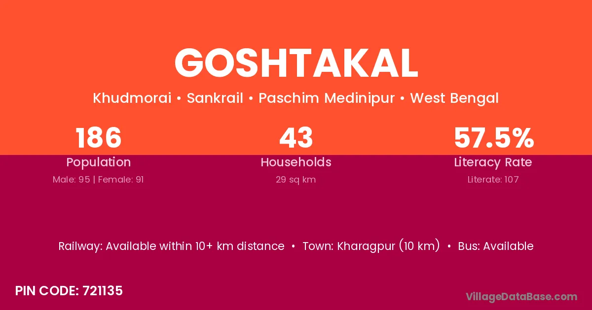 Kharagpur (10 km) is the nearest town to Goshtakal village for major economic activities and is located approximately 10 km away.