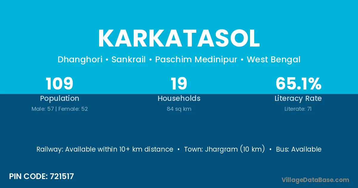 Jhargram (10 km) is the nearest town to Karkatasol village for major economic activities and is located approximately 10 km away.